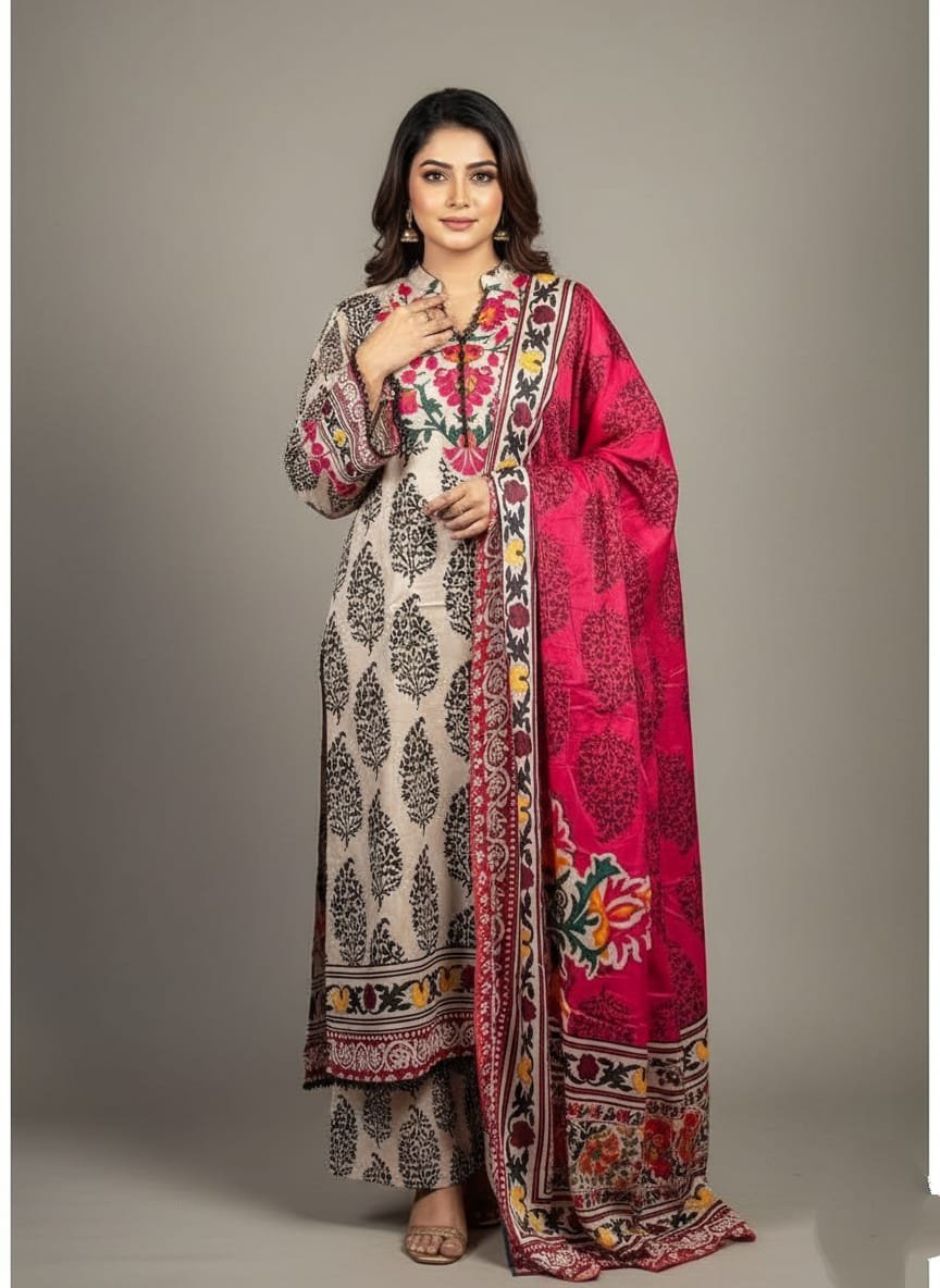 With the freedom to customize, this unstitched 3-piece ensemble allows you to design your perfect fit, adding a personal touch to your wardrobe. At only 1230 BDT, this dress set provides exceptional value without compromising on quality. Whether you’re attending a casual brunch or an evening event, this set offers endless styling possibilities to suit every occasion.