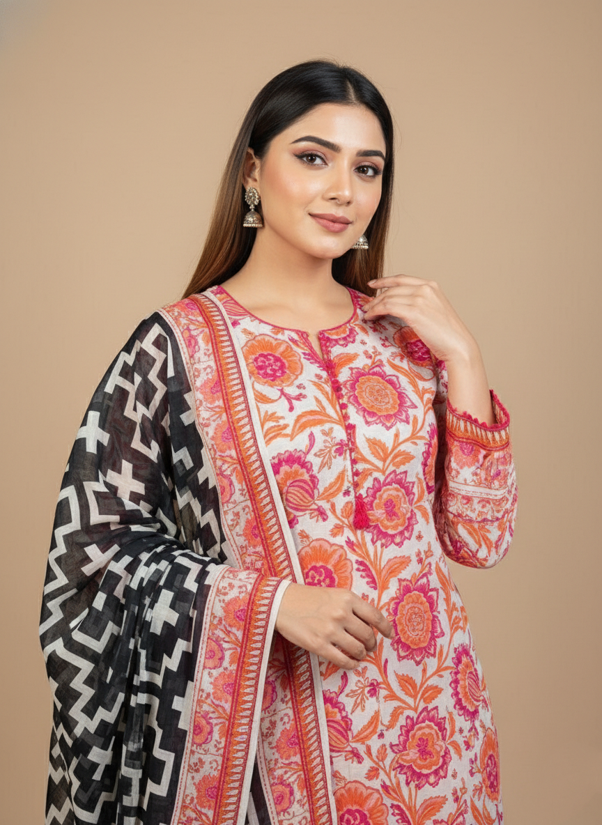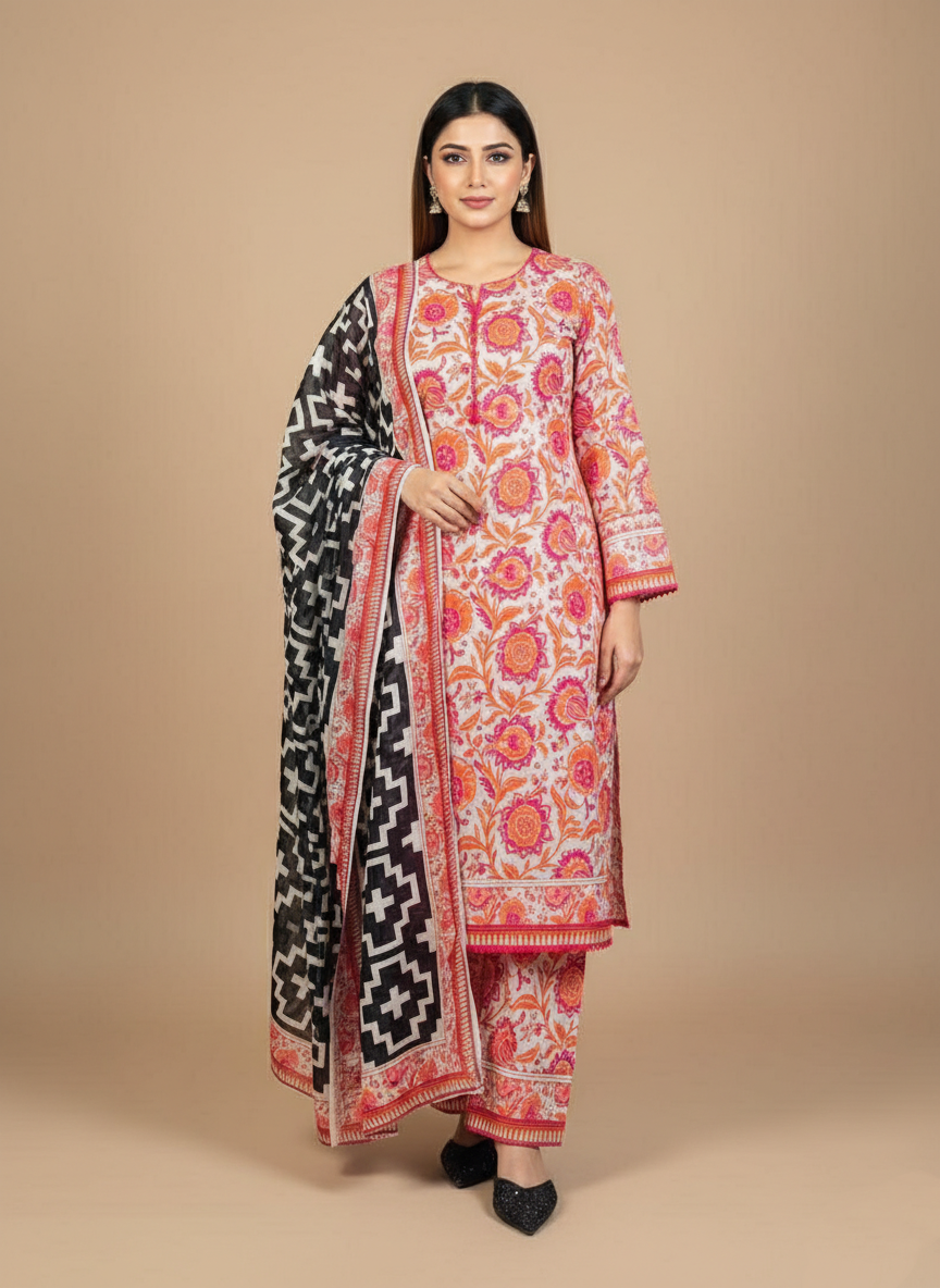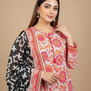 Crafted from 100% premium lawn cotton, this unstitched 3-piece set ensures a soft, breathable fabric that keeps you comfortable throughout the day. Perfect for staying cool during warm weather while looking effortlessly stylish.